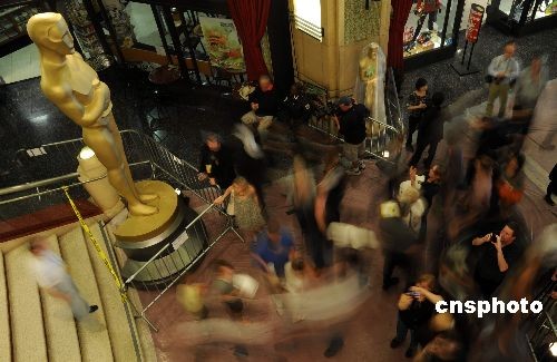 當(dāng)?shù)貢r間二月二十日,大批游客在好萊塢柯達(dá)劇場入口處的奧斯卡金像模型前留影。全球影迷矚目的第八十一屆奧斯卡電影金像獎頒獎典禮將于二十二日晚在這里舉行,柯達(dá)劇場內(nèi)外打扮一新,通往劇場的巨大紅地毯已經(jīng)鋪就,各項(xiàng)準(zhǔn)備工作基本就緒。中新社發(fā) 張煒 攝