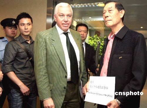 圖為香港海員工會(huì)主席郭錦華船長(右一)向俄羅斯駐港領(lǐng)事館工作人員遞交抗議書。中新社發(fā) 張勤 攝