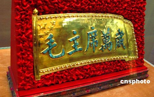 2月25日,在北京民族文化宮舉辦的《西藏民主改革50年大型展覽》免費向民眾開放。圖為展會展出十世班禪額爾德尼獻給毛澤東主席的“毛主席萬歲”金盾。中新社發(fā) 鄒憲 攝