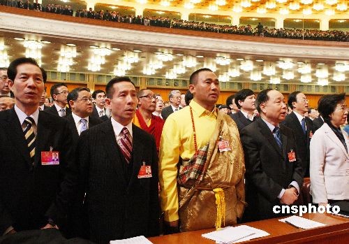 全國(guó)政協(xié)十一屆二次會(huì)議3月3日下午在人民大會(huì)堂隆重開幕,與會(huì)委員在開幕大會(huì)上高唱國(guó)歌。今年全國(guó)“兩會(huì)”在議程安排方面做出重大調(diào)整,在開幕式和閉幕式上,將原來的“奏國(guó)歌”改為“唱國(guó)歌”。這一改變采納了代表和委員的議案和提案。中新社發(fā) 宋吉河 攝