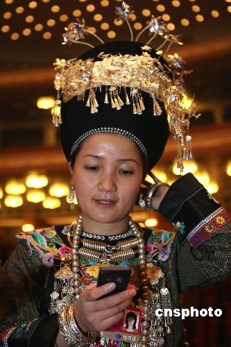 3月4日上午,十一屆全國人大二次會議預(yù)備會在北京人民大會堂舉行。來自重慶市黔江區(qū)的苗族女代表李小燕通過手機(jī)向家鄉(xiāng)“播報”大會盛況。中新社發(fā) 任晨鳴 攝