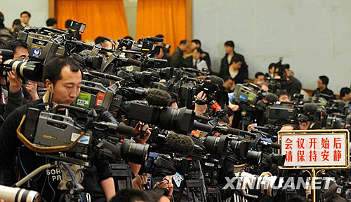 3月5日,第十一屆全國人民代表大會第二次會議在北京人民大會堂開幕。這是記者在會場采訪。黃敬文 攝
