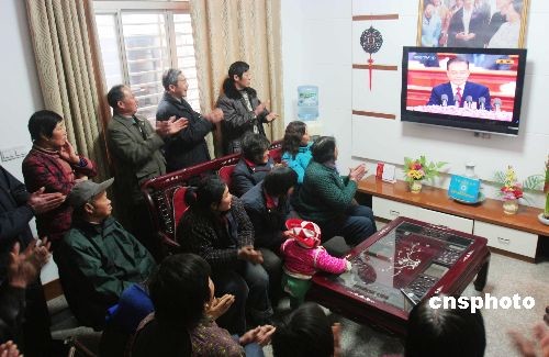 3月5日,江蘇省海安縣海安鎮(zhèn)園莊村的村民們聚集在一起收看“兩會”現(xiàn)場直播。當日,十一屆全國人大二次會議在北京人民大會堂召開,村民們覺得溫家寶總理在大會上所作的政府工作報告中提出的一系列惠農(nóng)政策深得人心。中新社發(fā) 周皖芹 攝