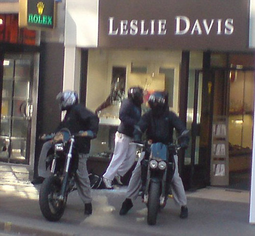 中新網(wǎng)3月8日電 據(jù)英國媒體報道,6日,一群摩托黨在倫敦最繁華的大街上搶劫了一家珠寶店。這已經(jīng)是該團伙第二次做案。實施搶劫的有4人,都戴著頭盔以隱藏面部,目擊者表示他們看上去不過是學生年紀。搶劫時,其中兩人沖進店里,用大錘砸碎櫥窗玻璃,拿走里面的手表和珠寶;另外兩人則一直開著引擎,等前者跳上車后即迅速離開。