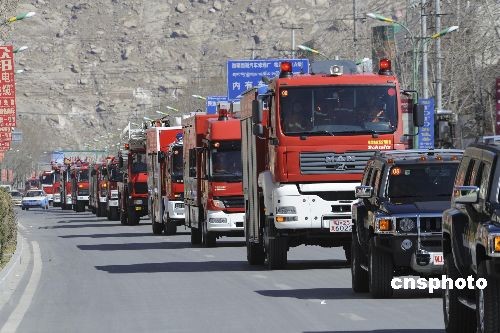 3月10日,西藏公安消防特種消防車(chē)輛行駛在拉薩街頭。當(dāng)日,西藏公安消防特種裝備車(chē)輛服役儀式在拉薩市舉行,26輛消防車(chē)輛在市區(qū)主要街道進(jìn)行拉動(dòng)演練。中新社發(fā) 廖攀 攝