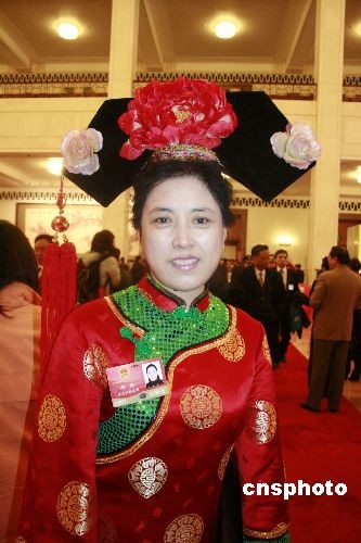 3月10日,圖為人大代表、滿族的那輝滿族裝束驚艷亮相人民大會堂。中新社發(fā) 金立冬 攝