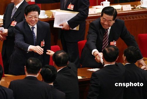 3月10日,全國政協(xié)主席賈慶林、全國人大常委會(huì)副委員長王兆國在十一屆全國人大二次會(huì)議第三次全體大會(huì)結(jié)束后和代表握手。中新社發(fā) 杜洋 攝