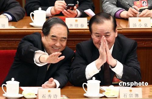 3月13日,十一屆全國人大第二次會議在人民大會堂舉行閉幕會,全國人大財政經(jīng)濟(jì)委員會主任委員石秀詩、貴州省委書記石宗源在主席臺上和主席臺下的代表打招呼。中新社發(fā) 杜洋 攝