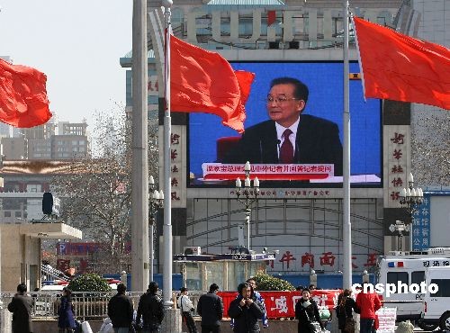 2009年3月13日,國務(wù)院總理溫家寶在人民大會堂與采訪全國兩會的中外記者見面,北京站站前大屏幕對此進(jìn)行實況轉(zhuǎn)播,吸引往來旅客的關(guān)注。中新社發(fā) 魯谷 攝