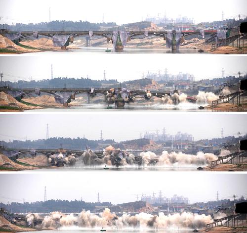 3月17日,橫跨長沙市澇刀河上的長湘公路廖家渡大橋成功爆破拆除。長湘公路廖家渡大橋長194米,橋面寬9米,為鋼筋混凝土四跨雙曲拱橋,跨徑40余米,始建于20世紀(jì)70年代初。2008年11月,廖家渡大橋出現(xiàn)橋墩間拱肋斷裂現(xiàn)象,為防止意外事故出現(xiàn),長沙市對(duì)該橋?qū)嵭蟹忾],并決定拆除重建。這次爆破采用分段微差起爆方式,從南向北分9段依次起爆,用時(shí)3秒。