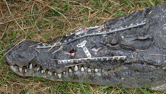 據(jù)英國(guó)媒體3月18日?qǐng)?bào)道,美國(guó)佛羅里達(dá)動(dòng)物園一只受傷的大鱷魚,經(jīng)過(guò)手術(shù),頭部被41枚釘子以及4塊鐵板固定,現(xiàn)在被人戲稱為“機(jī)器鱷魚”。這只長(zhǎng)達(dá)10英尺的鱷魚是在一起車禍?zhǔn)鹿手惺軅。?jīng)醫(yī)生介紹,現(xiàn)在鱷魚的恢復(fù)情況良好。