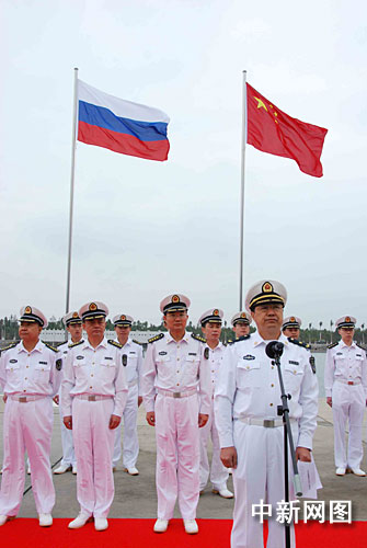 海軍南海艦隊副參謀長邢玉啟少將在碼頭上主持儀式,迎接俄軍艦到訪。華小平大校等海軍官兵出席了歡迎儀式。中俄海軍雙方還在碼頭接受了媒體共同采訪。