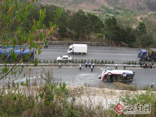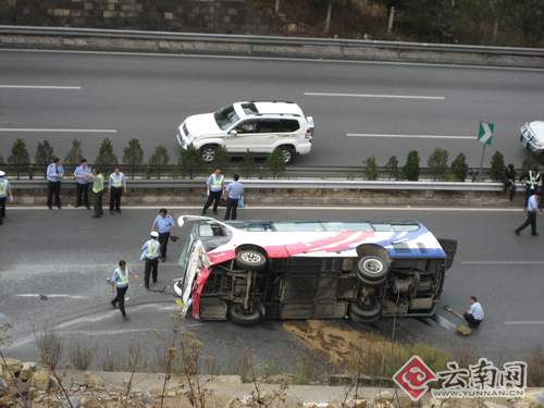18日下午1點(diǎn)45分,安楚高速公路昆明至楚雄方向K128+500米處(孔家莊隧道出去1公里)發(fā)生一起重大交通事故,一輛從下關(guān)開(kāi)往昆明載有29人的中型客車(chē)發(fā)生側(cè)翻,當(dāng)場(chǎng)死亡1人,28人受傷,其中重傷1人。事故發(fā)生后,交警部門(mén)對(duì)楚雄至昆明方向的高速路實(shí)施了封閉,記者去現(xiàn)場(chǎng)只能從320國(guó)道繞行至山上的小路,站在在距離事故現(xiàn)場(chǎng)約30米的山坡上,記者看到在開(kāi)往昆明方向的高速路上,一輛客車(chē)側(cè)翻在路中間,雖是開(kāi)往昆明方向,但車(chē)頭卻調(diào)轉(zhuǎn)了朝著相反方向。凹陷的車(chē)頭上,擋風(fēng)玻璃像蜘蛛網(wǎng)一樣滿是裂痕,右側(cè)有個(gè)很大的窟窿,車(chē)身旁邊一道長(zhǎng)長(zhǎng)的劃痕非常明顯,車(chē)身下漏了一大灘汽油,一塊標(biāo)有大理兩個(gè)字的白色牌子飛到了距離客車(chē)有5、60米的地方。這時(shí)交警部門(mén)正在做現(xiàn)場(chǎng)勘查,在汽油上散上了沙子。 “嘭”,我當(dāng)時(shí)聽(tīng)到一聲巨響,跑出來(lái)一看,就看見(jiàn)一輛客車(chē)翻在坡底的高速路上,有個(gè)人被甩出了車(chē)外躺在地上一動(dòng)不動(dòng),其他的乘客在車(chē)上哭的哭,喊的喊!备咚俾放缘某鄞笸叻看宓囊晃淮迕衲慷昧塑(chē)禍時(shí)的情景。附近一位路過(guò)的駕駛員猜測(cè)說(shuō),從擋墻在撞擊的痕跡上看,客車(chē)可能是撞上可擋墻后,又反彈回來(lái),駕駛員急忙打方向盤(pán),車(chē)子就來(lái)了個(gè)360度大轉(zhuǎn)身后翻倒在地!斑@段路過(guò)了隧道后,因?yàn)槭窍缕侣范,不少大?chē)司機(jī)踩剎車(chē)時(shí)會(huì)不停地淋水,所以路面比較滑,司機(jī)車(chē)速稍一快就容易出事。”