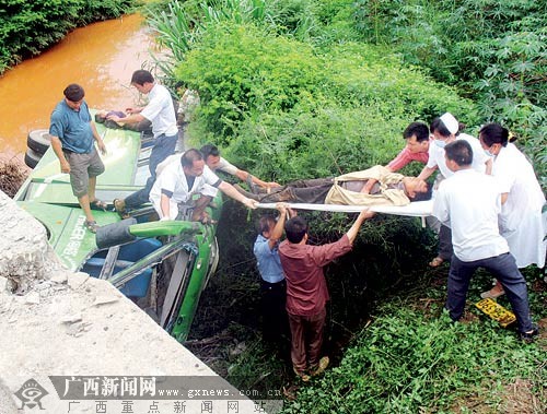 上午8時(shí)50分,蘇圩鎮(zhèn)那海村村民梁仕元在村口搭乘這輛開往南寧的客車。十幾分鐘后,他感到客車開始搖擺,他雙手緊緊抓住座椅,雙腳蹬住前面的椅子,把自己的身體固定住。緊接著,客車就撞斷那花橋的幾個(gè)護(hù)欄,沖進(jìn)橋下的水溝邊?蛙嚊_下橋的過程中,梁仕元被撞得頭有點(diǎn)暈,好在只是受點(diǎn)輕傷,他從車窗爬了出來。