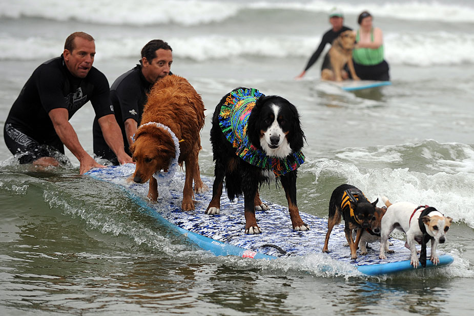 6月20日,在美國(guó)加利福尼亞州帝國(guó)沙灘舉行了一場(chǎng)小狗沖浪比賽,小狗們表現(xiàn)得十分認(rèn)真。