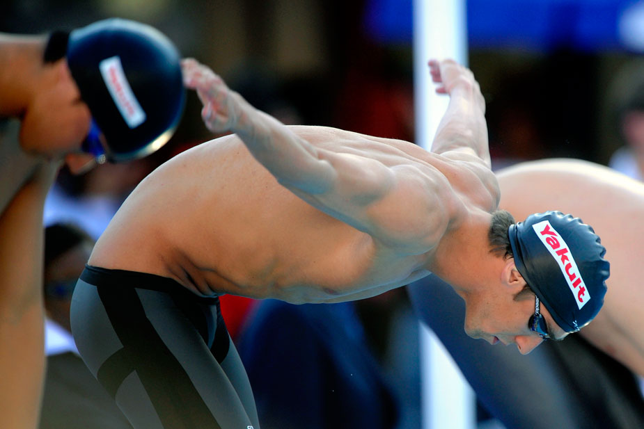 “我要飛得更高”——7月29日,美國選手菲爾普斯在男子200米蝶泳決賽入水前伸展雙臂。