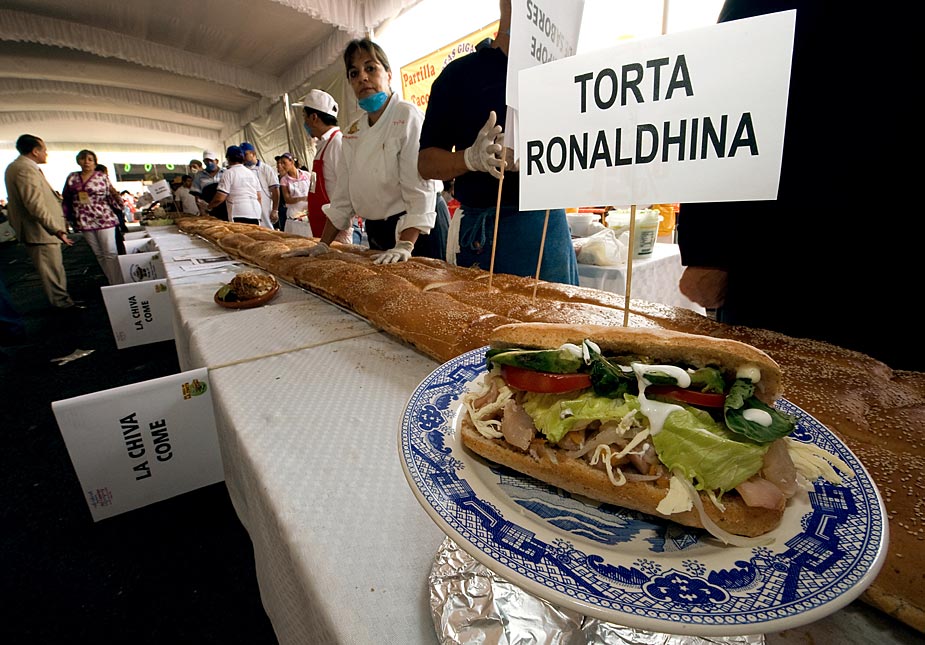 7月31日,在墨西哥首都墨西哥城舉辦的“墨西哥三明治節(jié)”上,200多人用肉、火腿、西紅柿、奶酪等各種餡料合作制成了長達(dá)46米的墨西哥三明治,試圖創(chuàng)造世界最長的墨西哥三明治紀(jì)錄。