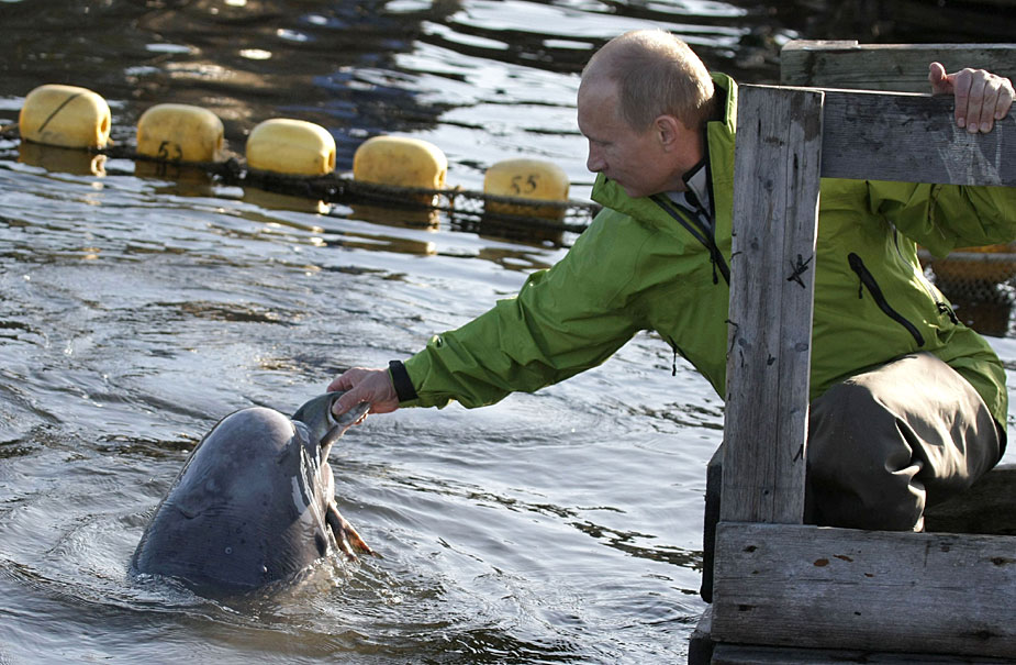 俄羅斯總理普京7月31日在太平洋的契卡洛夫島為一條白鯨裝上衛(wèi)星追蹤器。其后他更幫手喂其他白鯨魚吃。