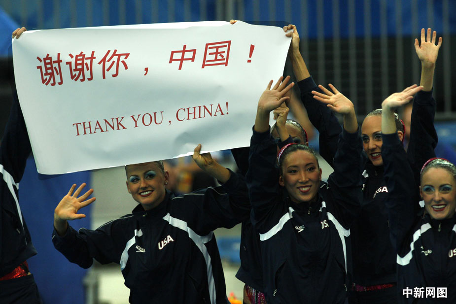 謝謝你中國——8月23日,美國花游隊(duì)隊(duì)員入場時(shí),打出“謝謝你,中國”的條幅。