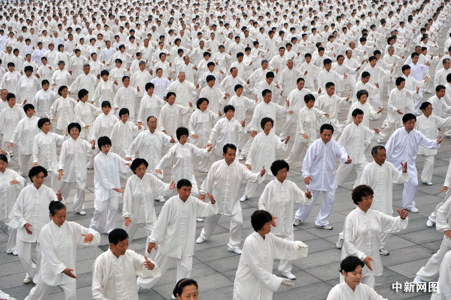 8月8日,全國首個(gè)“全民健身日”北京主會(huì)場(chǎng)啟動(dòng)儀式上,三萬多群眾進(jìn)行太極拳展示活動(dòng),在世界吉尼斯總部認(rèn)證官員的見證下成功打破世界紀(jì)錄。中新網(wǎng)記者 金碩 攝
