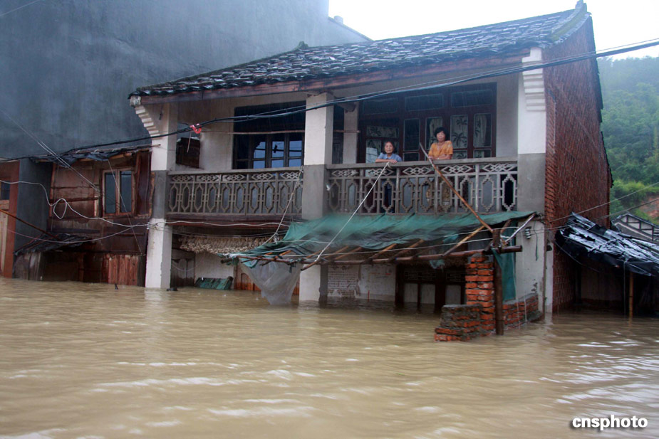 八月九日,受臺風(fēng)“莫拉克”強降雨的影響,福建寧德福鼎南墘村大面積受淹,大水同時也將通往該村的道路全部淹沒,致使該村猶如“孤島”,該村近三百名村民被困。中新社發(fā) 彭登筍 攝