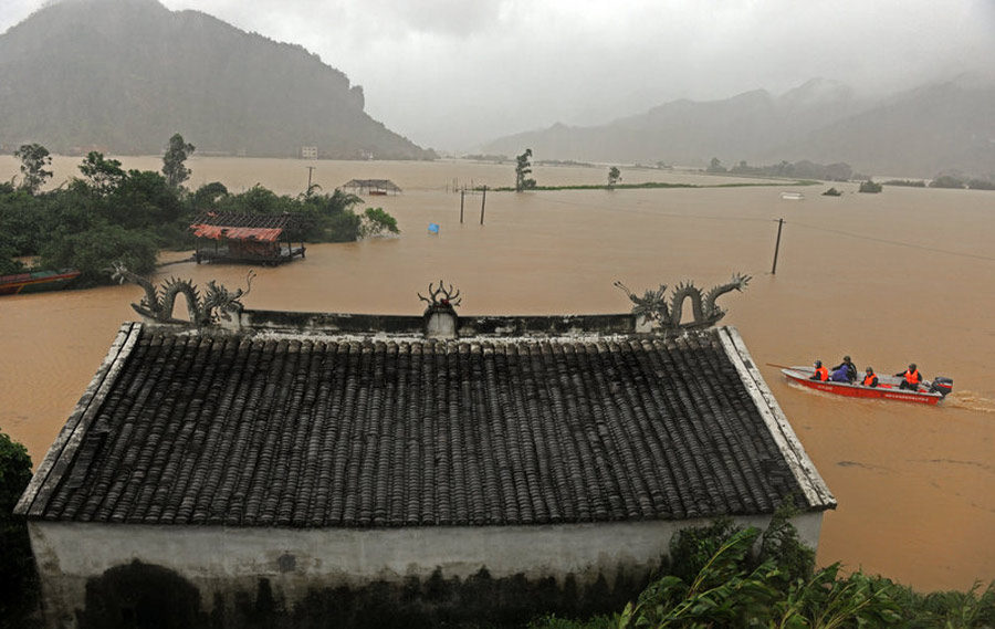 2009年8月9日,浙江溫州蒼南的附近農(nóng)村受臺(tái)風(fēng)大暴雨影響,大片村莊被淹。李頎拯/CFP