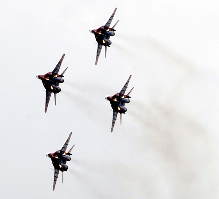 8月18日,2009莫斯科國(guó)際航空航天展(MAKS-2009)開(kāi)幕。圖為精彩的飛行表演。