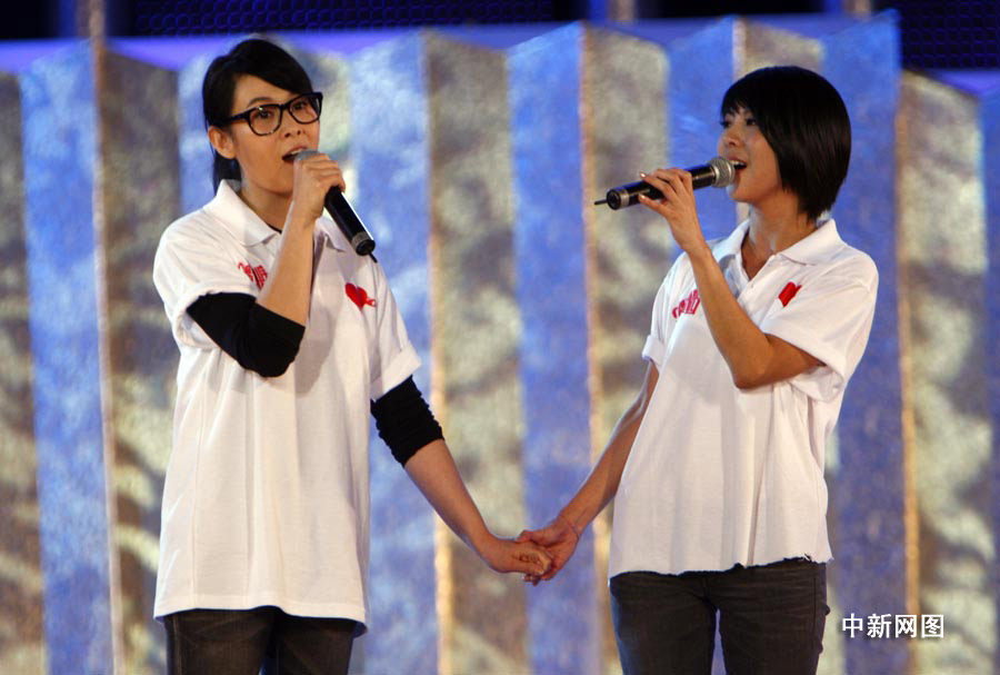 “跨越海峽的愛心”——大陸同胞援助臺灣“莫拉克”臺風受災同胞賑災晚會在北京舉行。眾多文體界明星在現(xiàn)場亮相,獻出一片愛心。圖為劉若英和許茹蕓在晚會現(xiàn)場獻唱。中新社發(fā) 杜洋 攝