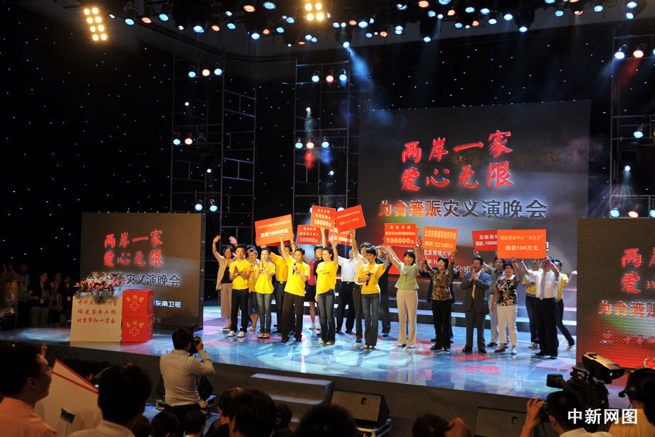 8月22日晚,北京舉行“兩岸一家 愛心無(wú)限”為臺(tái)灣同胞賑災(zāi)義演晚會(huì),大陸和臺(tái)灣演藝界明星登臺(tái)為臺(tái)灣災(zāi)區(qū)同胞共獻(xiàn)愛心,晚會(huì)臨近結(jié)束時(shí)共收到各界捐款3000多萬(wàn)元。中新網(wǎng)記者 金碩 攝