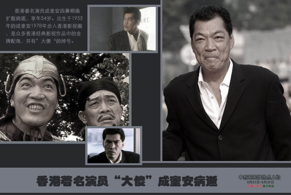 中新網(wǎng)本周熱點(diǎn)人物之——成奎安 北京時(shí)間27日晚23時(shí)45分,香港著名演員成奎安因鼻咽癌擴(kuò)散病逝,享年54歲。出生于1955年的成奎安1978年步入香港影視圈,是眾多香港經(jīng)典影視作品中的金牌配角,并有”大傻“的綽號(hào)。