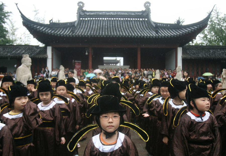 2009年8月31日,南京夫子廟小學(xué)一年級新生在南京夫子廟參加了“開筆破蒙”儀式。點(diǎn)朱砂、寫“人”字、念《論語》……接受傳統(tǒng)文化熏陶成為孩子們新學(xué)期的第一課。一年級新生穿著統(tǒng)一的“祭孔服”,老師們挨個在孩子們額頭點(diǎn)上朱砂痣,并送上祝福的話。點(diǎn)朱砂,又稱“開天眼”,寓意孩子從此眼明心明,好讀書,讀好書。麥兜/CFP