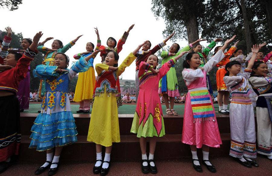 北京中關(guān)村三小開學(xué)典禮上,56個民族小伙伴齊唱高唱《好大的家》。本學(xué)年民族教育主題為“祖國發(fā)展我成長,民族團(tuán)結(jié)一家親”。李木易/CFP