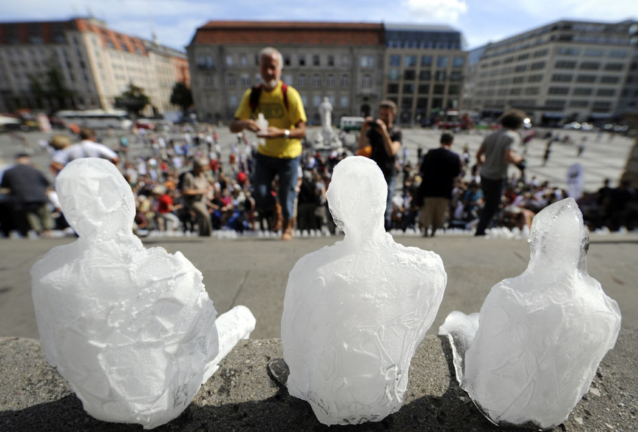 9月2日,德國柏林,世界野生動(dòng)物基金會(huì)(WWF)將1000個(gè)小冰人被放置在了御林廣場音樂廳的臺(tái)階上,小冰人慢慢融化成水;顒(dòng)的組織者希望此舉能引起公眾對于全球變暖的關(guān)注。來源:中國新聞網(wǎng)