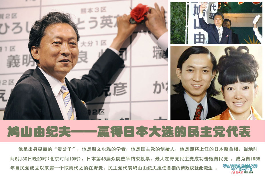 中新網(wǎng)本周熱點人物之——鳩山由紀夫 他是出身顯赫的“貴公子”,他是溫文爾雅的學者,他是民主黨的創(chuàng)始人,他是即將上任的日本新首相。 當?shù)貢r間8月30日晚20時(北京時間19時),日本第45屆眾院選舉結(jié)束投票。最大在野黨民主黨成功擊敗自民黨 ,成為自1955年自民黨成立以來第一個取而代之的在野黨。民主黨代表鳩山由紀夫擔任首相的新政權就此誕生 。來源:中國新聞網(wǎng)