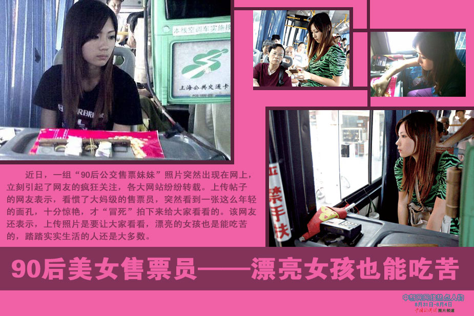 中新網(wǎng)本周熱點人物之——90后美女售票員 近日,一組“90后公交售票妹妹”照片突然出現(xiàn)在網(wǎng)上,立刻引起了網(wǎng)友的瘋狂關注,各大網(wǎng)站紛紛轉載。上傳帖子的網(wǎng)友表示,看慣了大媽級的售票員,突然看到一張這么年輕的面孔,十分驚艷,才“冒死”拍下來給大家看看的。該網(wǎng)友還表示,上傳照片是要讓大家看看,漂亮的女孩也是能吃苦的,踏踏實實生活的人還是大多數(shù)。來源:新華網(wǎng)