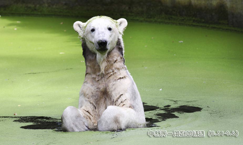 9月4日,德國(guó)柏林動(dòng)物園的明星北極熊克努特正在水中“自娛自樂”。圖片來源:中國(guó)新聞網(wǎng)