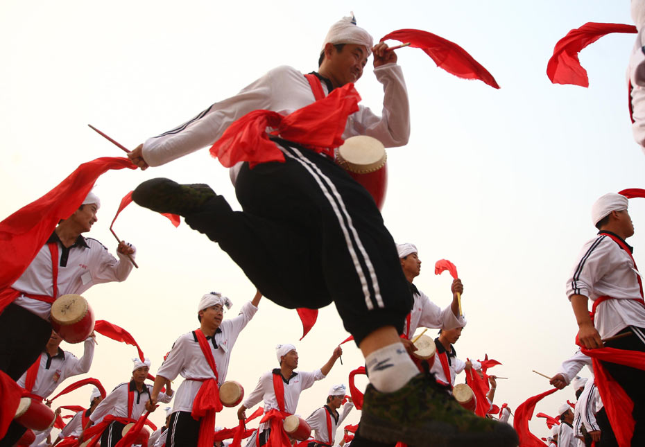 9月16日,千余名來自陜西安塞的腰鼓隊員在北京密云訓練基地首次和其他方陣合練。該方陣隊員全部是來自陜西省延安市安塞縣的農(nóng)民,10月1日他們將走在群眾游行隊伍中,在天安門城樓前舞起安塞腰鼓。該方陣也是群眾游行隊伍中唯一一支京外隊伍,唯一一個全部由農(nóng)民組成的方陣。杜洋 攝 圖片來源:中國新聞網(wǎng)