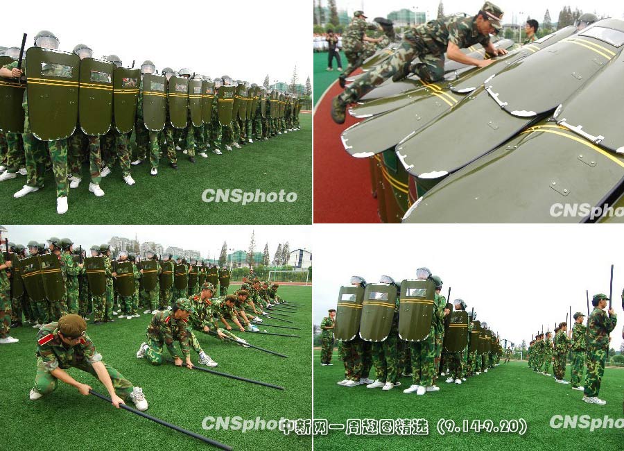 9月18日,江蘇省揚(yáng)州大學(xué)廣陵學(xué)院新生軍訓(xùn)拉開序幕。與往年不同的是,該校今年軍訓(xùn)增加了反恐防暴。圖片來源:中國新聞網(wǎng)