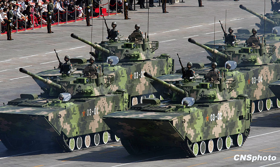 2009年10月1日,中華人民共和國成立60周年慶祝大會在北京天安門廣場舉行。圖為兩棲突擊車方隊。中新社發(fā) 趙振清 攝
