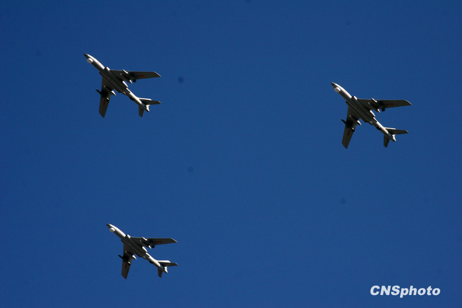 2009年10月1日,中華人民共和國成立60周年慶祝大會在北京天安門廣場舉行。圖為轟炸機梯隊飛過天安門廣場上空。中新社發(fā) 郭國權(quán) 攝