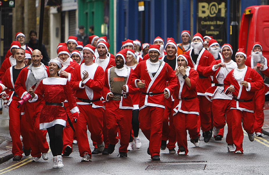 10月6日,英國倫敦市中心100多位圣誕老人為籌集乳腺癌護(hù)理善款而參加歡樂跑活動(dòng)。圖片來源:中國新聞網(wǎng)