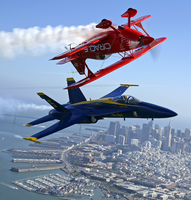 2009年10月8日,美軍飛機(jī)在舊金山灣上空進(jìn)行飛行演練。一年一度的舊金山艦隊(duì)周將于10月10日開幕,屆時(shí)會(huì)有船艦游行和飛行表演等活動(dòng)。 來(lái)源:中國(guó)新聞網(wǎng)