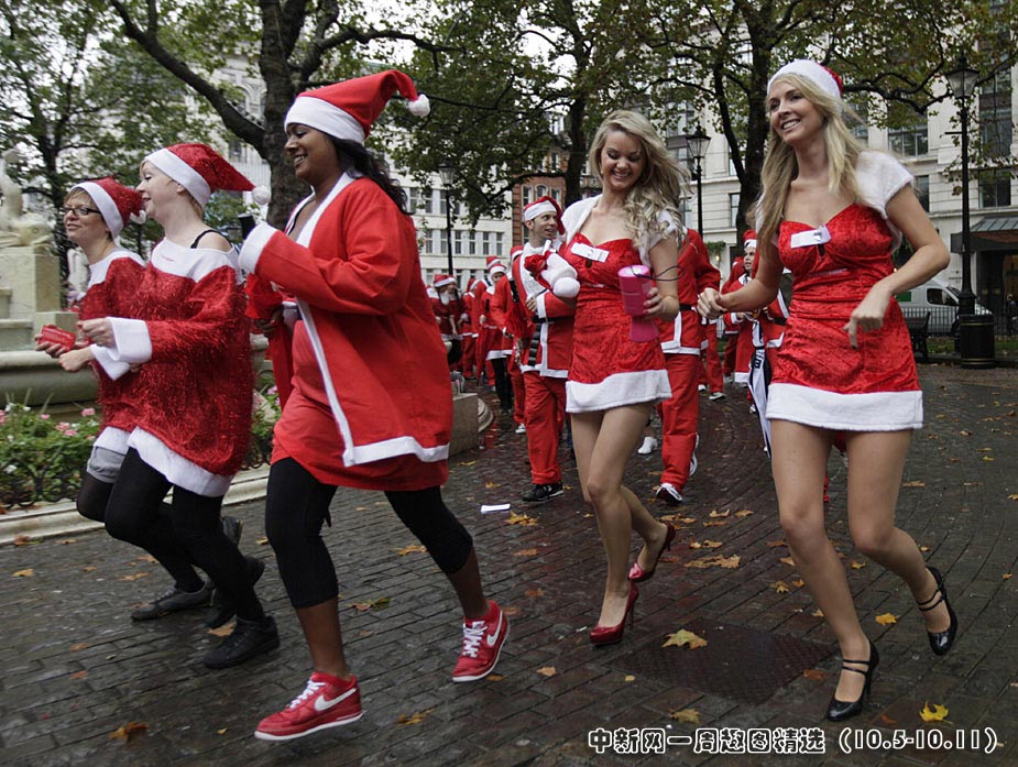 10月6日,英國倫敦市中心100多位圣誕老人為籌集乳腺癌護理善款而參加歡樂跑活動。來源:中國新聞網