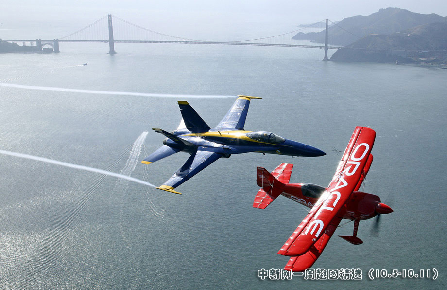 2009年10月8日,美軍飛機在舊金山灣上空進行飛行演練。一年一度的舊金山艦隊周將于10月10日開幕,屆時會有船艦游行和飛行表演等活動。來源:中國新聞網(wǎng)