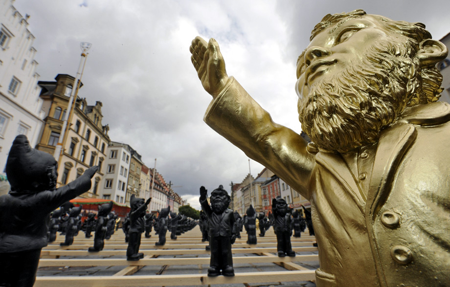 10月14日,德國(guó)施特勞賓市街頭擺放了1250個(gè)行納粹禮的花園土地神像,“行納粹禮的花園土地神”其實(shí)是一款雕塑作品,是由59歲的德國(guó)藝術(shù)家?jiàn)W特馬爾·赫勒爾創(chuàng)作的目的在于提醒人們警惕法西斯思想,反對(duì)使用法西斯思想控制大眾。