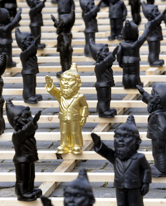 10月14日,德國施特勞賓市街頭擺放了1250個行納粹禮的花園土地神像,“行納粹禮的花園土地神”其實(shí)是一款雕塑作品,是由59歲的德國藝術(shù)家奧特馬爾·赫勒爾創(chuàng)作的目的在于提醒人們警惕法西斯思想,反對使用法西斯思想控制大眾。