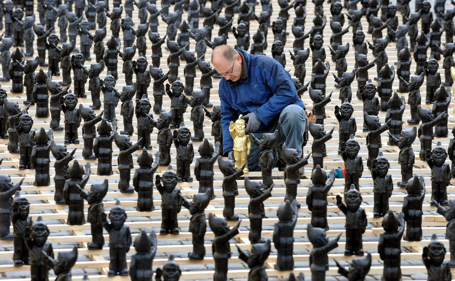 10月14日,德國施特勞賓市街頭擺放了1250個(gè)行納粹禮的花園土地神像,“行納粹禮的花園土地神”其實(shí)是一款雕塑作品,是由59歲的德國藝術(shù)家奧特馬爾·赫勒爾創(chuàng)作的目的在于提醒人們警惕法西斯思想,反對使用法西斯思想控制大眾。