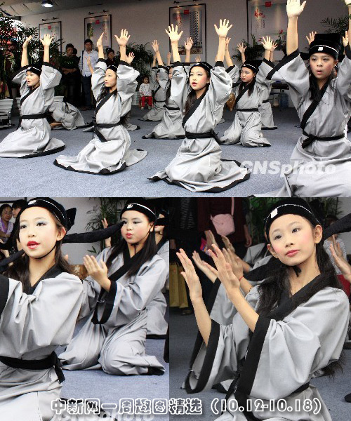 10月15日,2009年湖北宜昌秋季房地產(chǎn)交易會(huì)開幕,一家房地產(chǎn)公司還請(qǐng)來小學(xué)生現(xiàn)場(chǎng)進(jìn)行國學(xué)表演,吟唱“三字經(jīng)”,為房交會(huì)增添文化氣息。圖片來源:中國新聞網(wǎng)