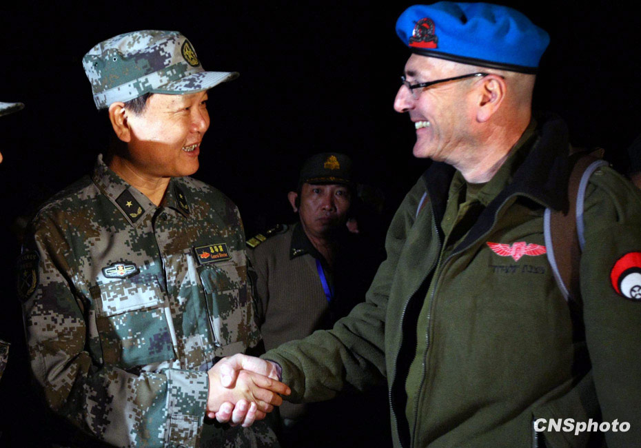 當晚國防大學(xué)防務(wù)學(xué)院、空軍指揮學(xué)院的外軍學(xué)員,以及英國、以色列、土耳其、巴基斯坦等國軍事觀察員親臨現(xiàn)場觀摩了后勤保障戰(zhàn)斗準備、自行榴彈炮占領(lǐng)陣地、裝甲車輛“摸黑”開進等戰(zhàn)斗要素。圖為演習(xí)總導(dǎo)演、某集團軍參謀長胡修斌少將,在陣地與外軍觀摩團他曾經(jīng)的老朋友、老“同行”親切交談。中新社發(fā) 宋吉河 攝