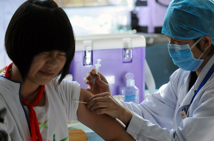 周三(21日),北京市朝陽(yáng)區(qū)垂楊柳中學(xué)初一(2)班的學(xué)生正在接種甲型H1N1流感疫苗。從當(dāng)天起至12月31日期間,北京市的中小學(xué)生、老人等五類重點(diǎn)人群,在知情自愿的原則下,將免費(fèi)接種甲流疫苗。中新社發(fā) 侯宇 攝